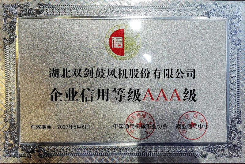 雙劍風(fēng)機(jī)憑借雄厚的生產(chǎn)經(jīng)營(yíng)實(shí)力和良好的市場(chǎng)信譽(yù),被中國(guó)通用機(jī)械工業(yè)協(xié)會(huì)(CGMA)和商業(yè)信用中心授予“企業(yè)信用等級(jí)AAA級(jí)”榮譽(yù)。
